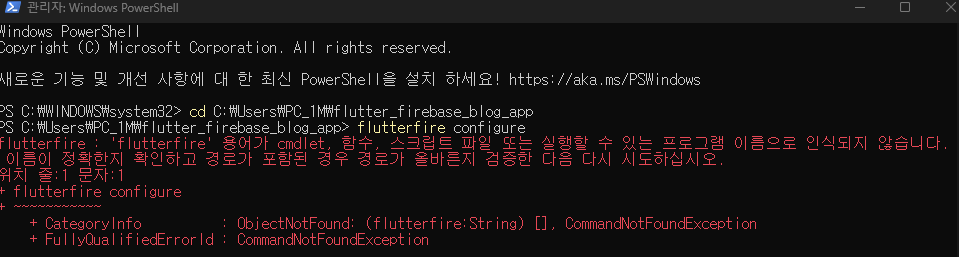 PowerShell에서 flutterfire 명령어 인식되지 않는 문제